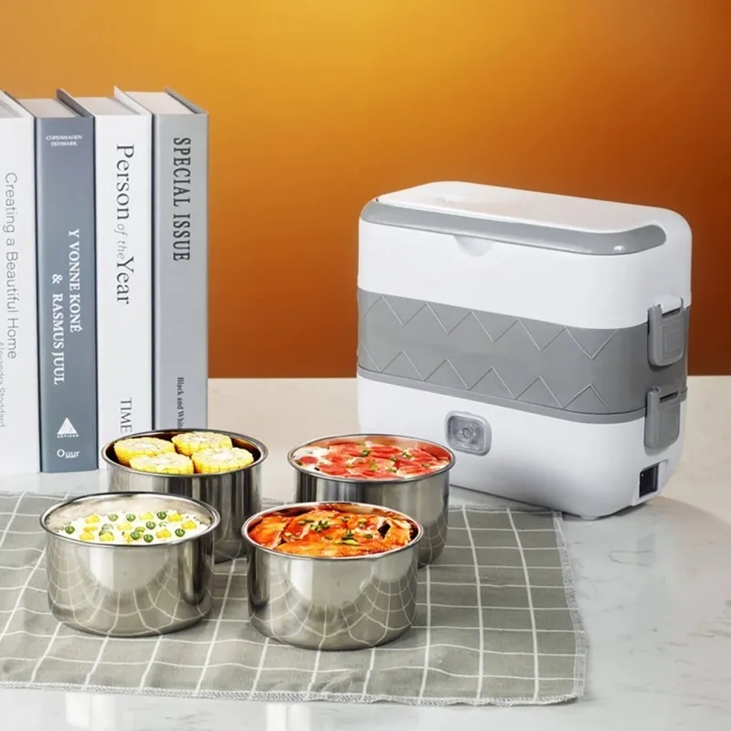 DescripciónLonchera para cocinar y calentar comida al vapor, incluye cuatro recipientes metálicos con tapa, cable de poder y taza medidora de agua.Se puede usar con los cuatro recipientes o solo dos dependiendo la cantidad de comida.Medidas del recipiente: 11.5 x 7.3 cmFicha TécnicaAlto 21cmLargo 25cmProfundidad 12cmMaterial Plástico y Metal